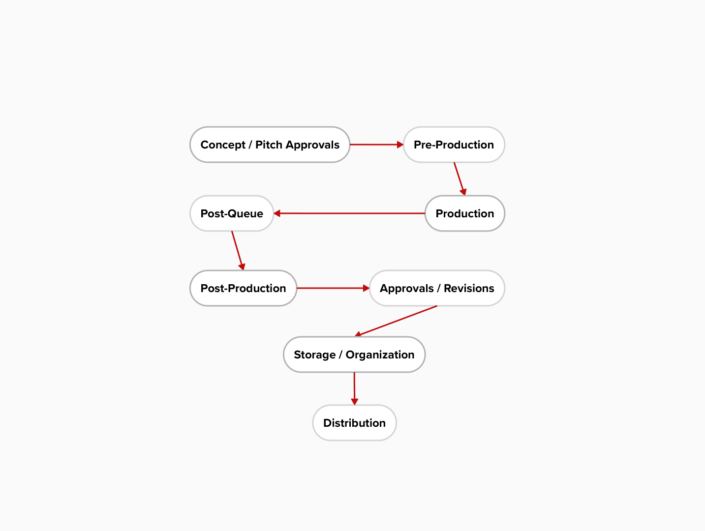 The pipeline starts with strategic planning and research, which flows directly into content strategy and calendar development. From there we move into a three-stage production process. After deliverables are approved, assets are stored in dedicated folders within the chosen cloud system and tagged by project, date, and content type, remaining directly linked to the content calendar for ongoing visibility and control. Then distribution becomes a seamless one-step process directly from the content calendar where everything is clean & organized.